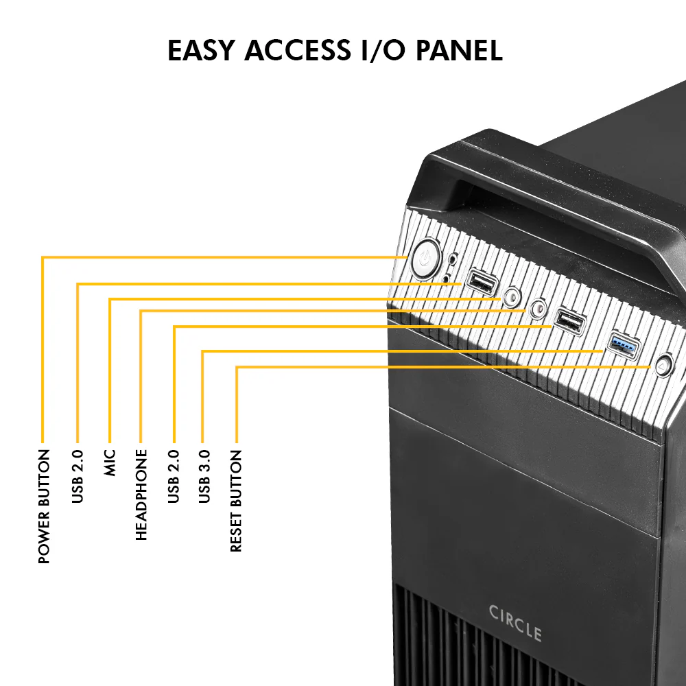 Front I/O connectivity provides USB 3.0 Type-A for faster data transfer, USB 2.0 Type-A for peripherals, and audio in/out jacks for everyday usage convenience,