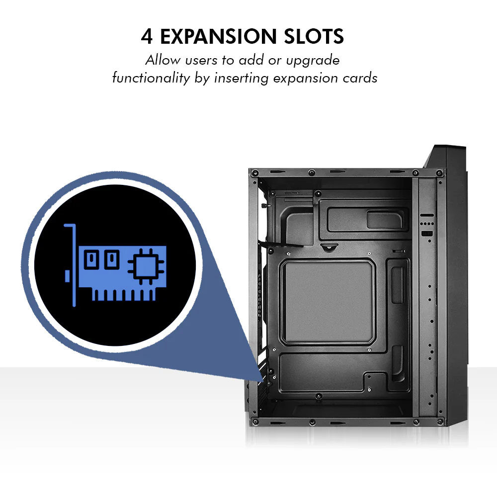 Compact Micro-ATX cabinet with included power supply and efficient airflow vents