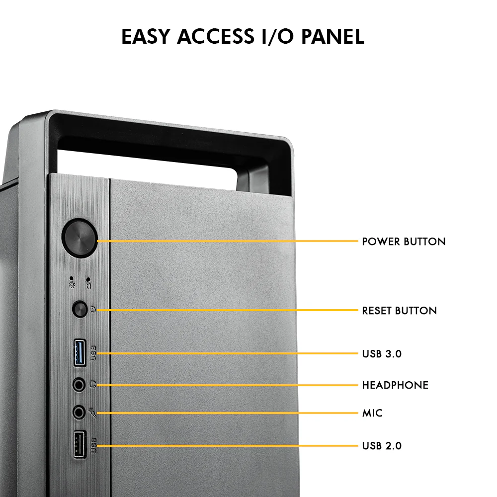Front I/O connectivity offers USB 3.0 Type-A and USB 2.0 Type-A ports, HD audio jacks, power and reset buttons within easy reach for peripherals and accessories,