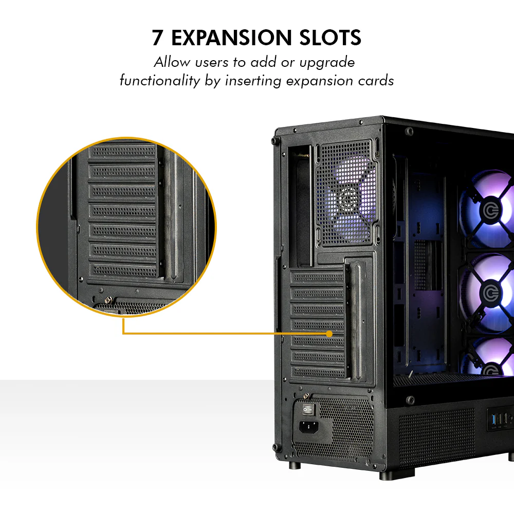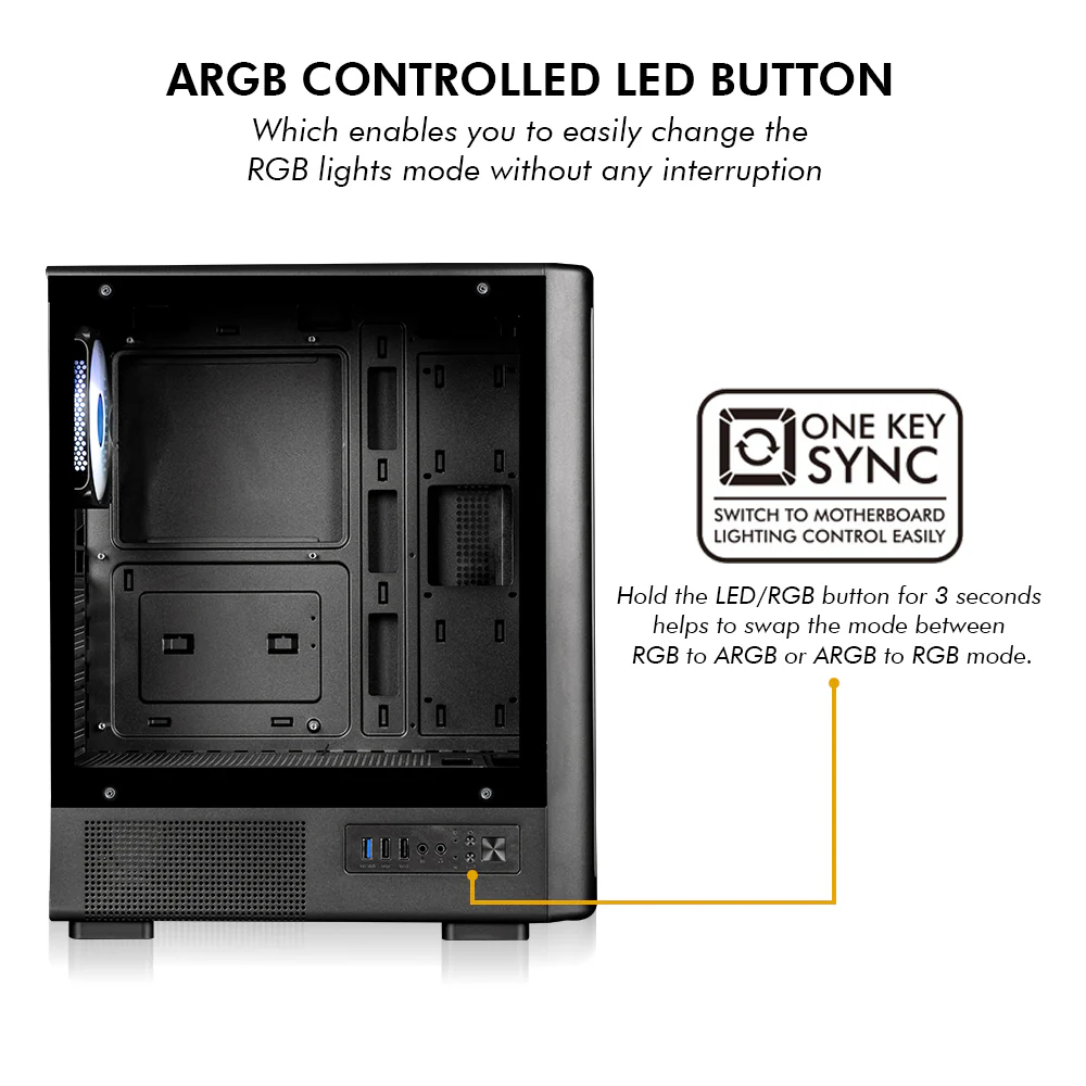 ARGB front panel design delivers customizable lighting effects, giving gaming setups a bold visual presence without additional accessories,