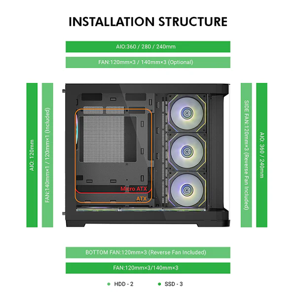 Supports ATX / Micro-ATX / Mini-ITX motherboards