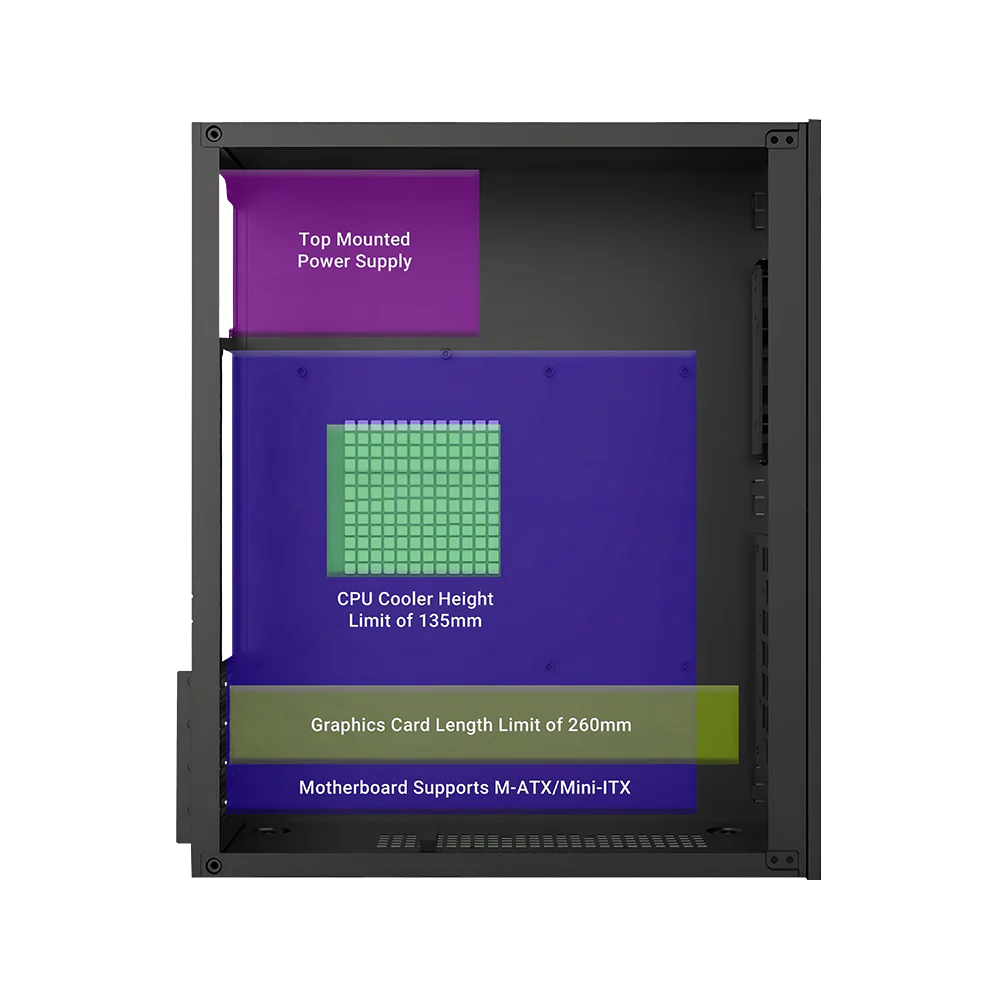 Supports Micro-ATX and Mini-ITX motherboards with essential component clearance