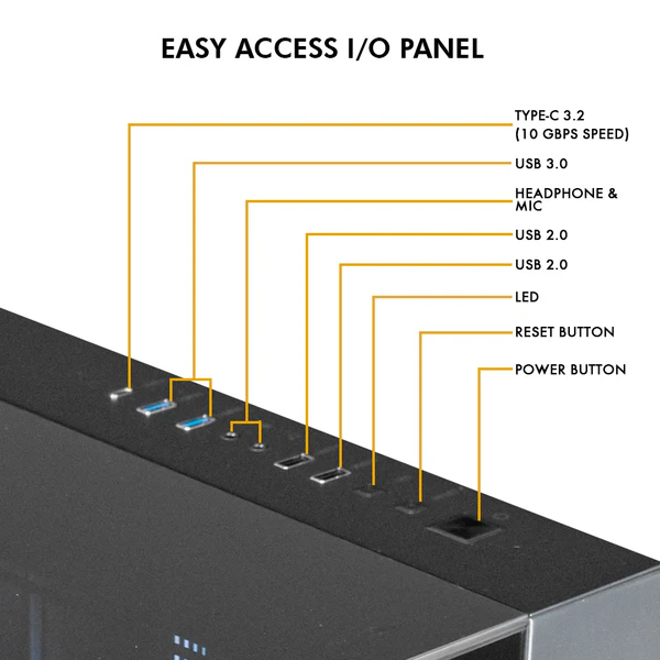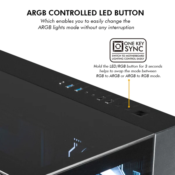 Striking ARGB front design gives the cabinet a bold gaming look with bright lighting effects,