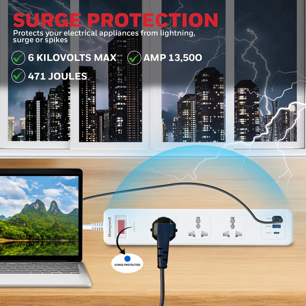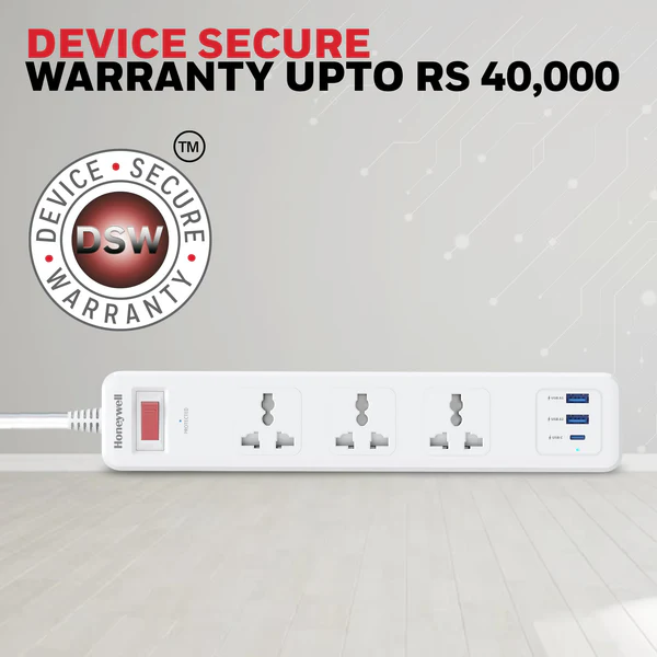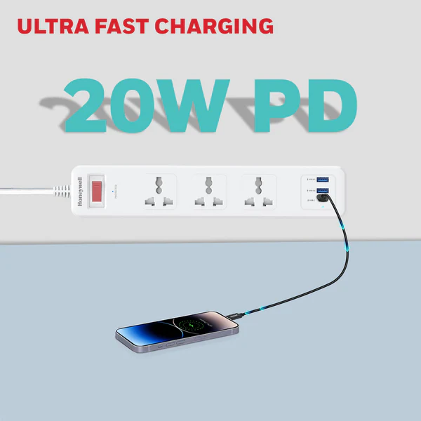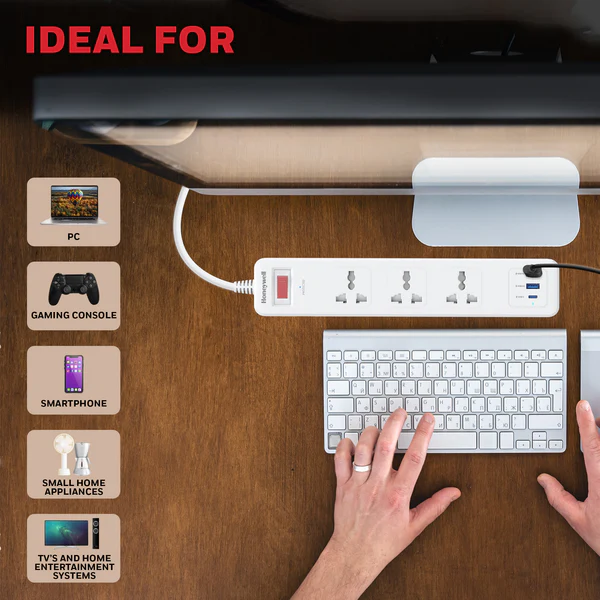 The Honeywell 3 Outlet Surge Protector with 1x Type-C PD & 2x USB (White) is a compact and reliable spike guard designed for modern homes and offices where you need both power sockets and fast charging ports in one unit. It features 3 universal sockets, allowing you to connect devices such as computers, monitors, printers, routers, and adapters.