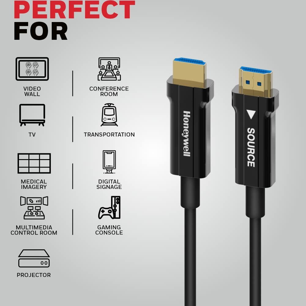 The Honeywell HDMI AOC 2.0 Cable is designed for smooth and stable high-quality audio and video transmission, making it ideal for long-distance connectivity between devices. It supports up to 4K resolution, ensuring clear and sharp output for TVs, monitors, and projectors.